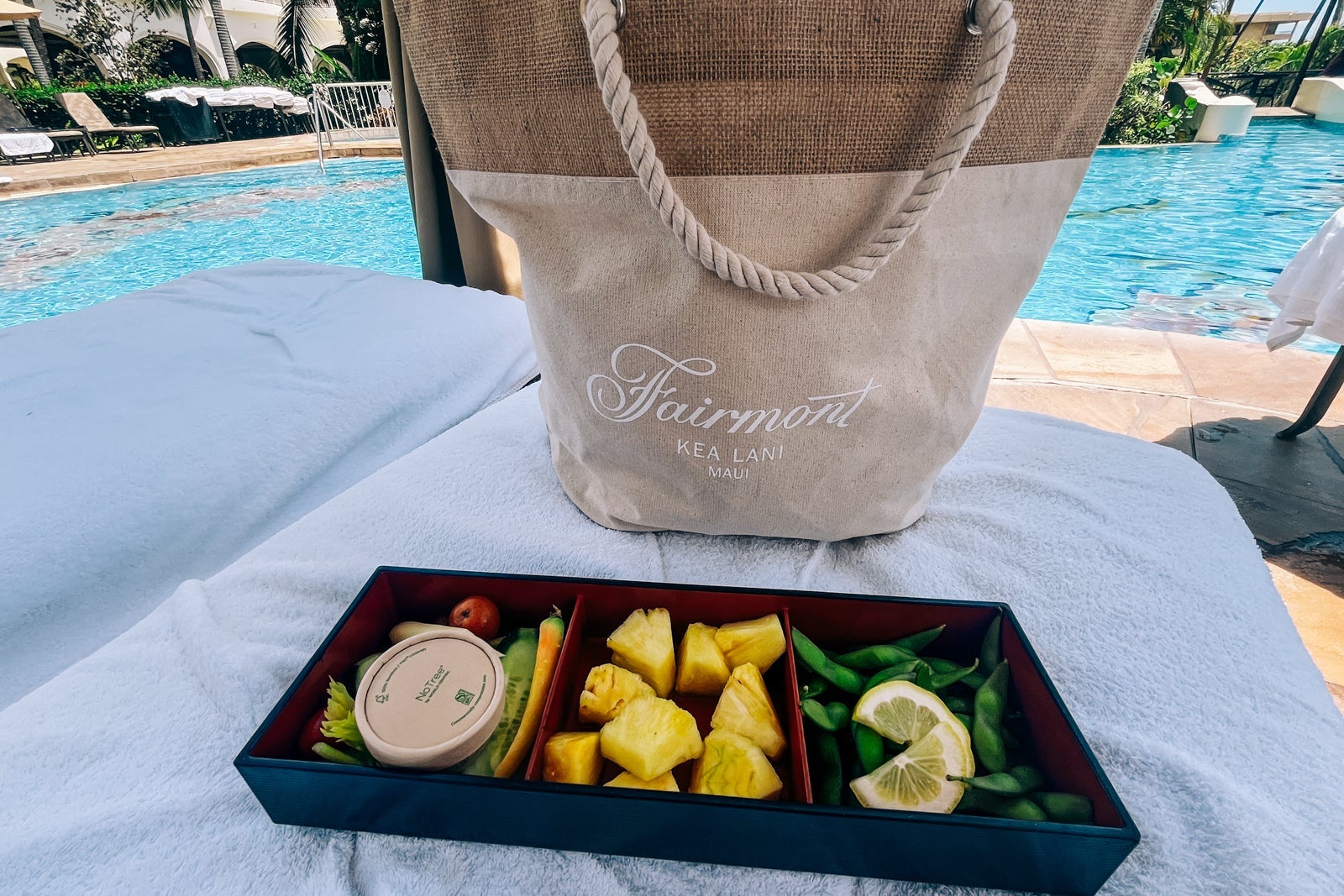 Cabana rentals come with a bento box of edamame and fresh pineapple to snack on, as well as a soft-sided cooler stocked with ice, water, juices and sodas. Pool attendants regularly make the rounds checking on guests and, in the afternoon, bring around frozen chocolate mochi bites for everyone to enjoy.
