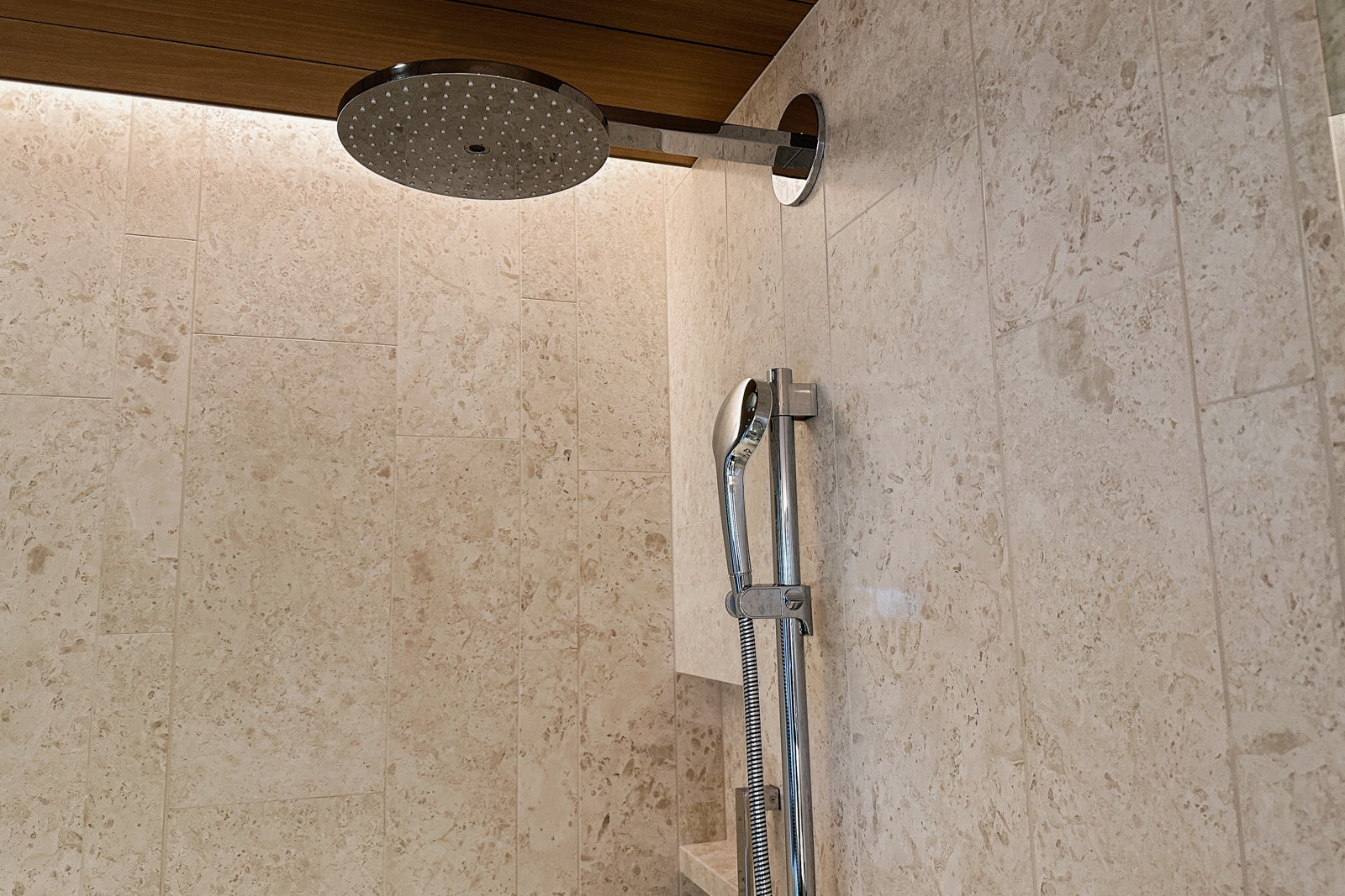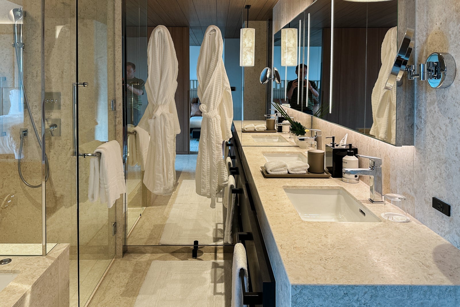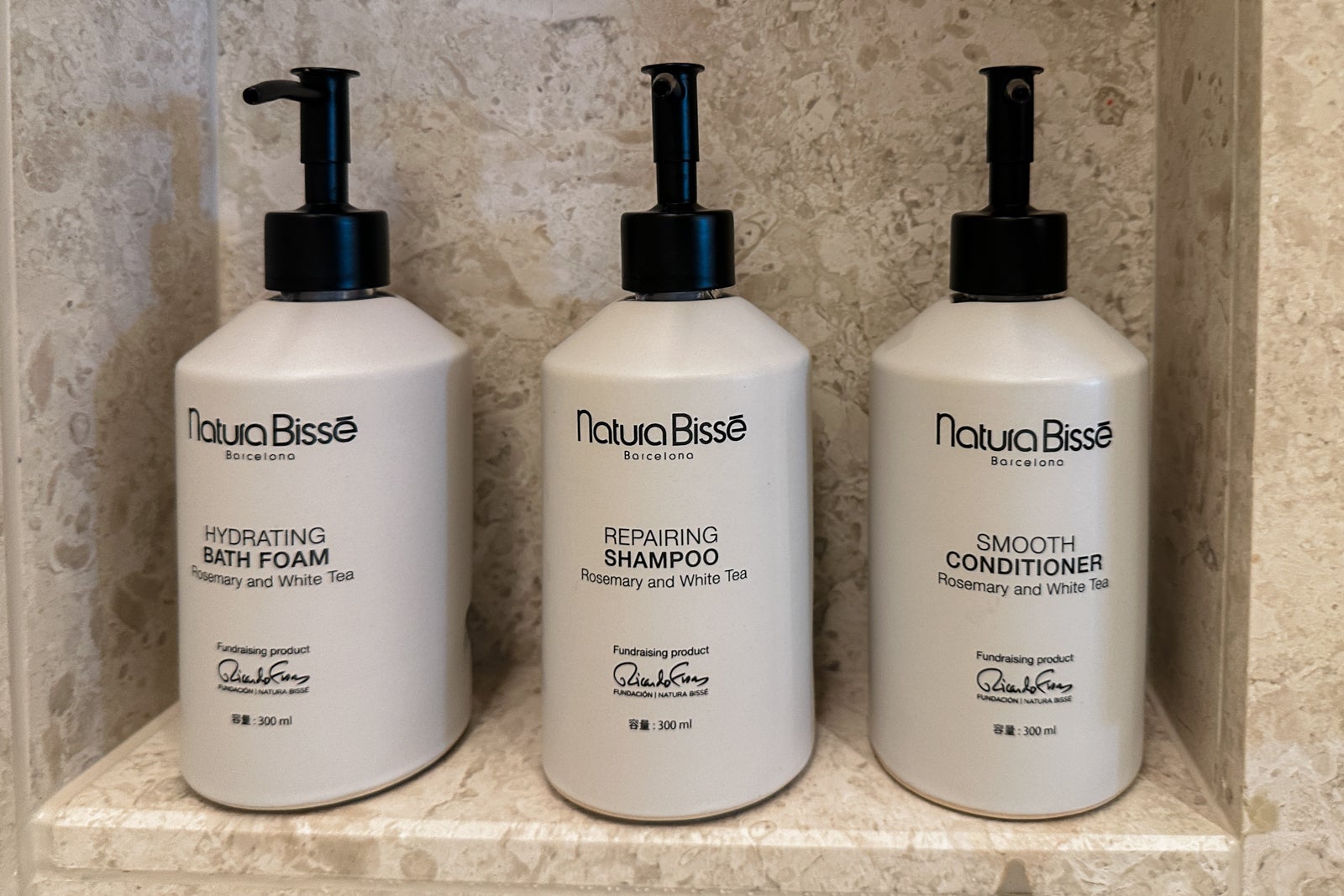 Natura Bisse rosemary and white tea products, like shampoo, soaps and lotions, were placed around the shower and square tub.