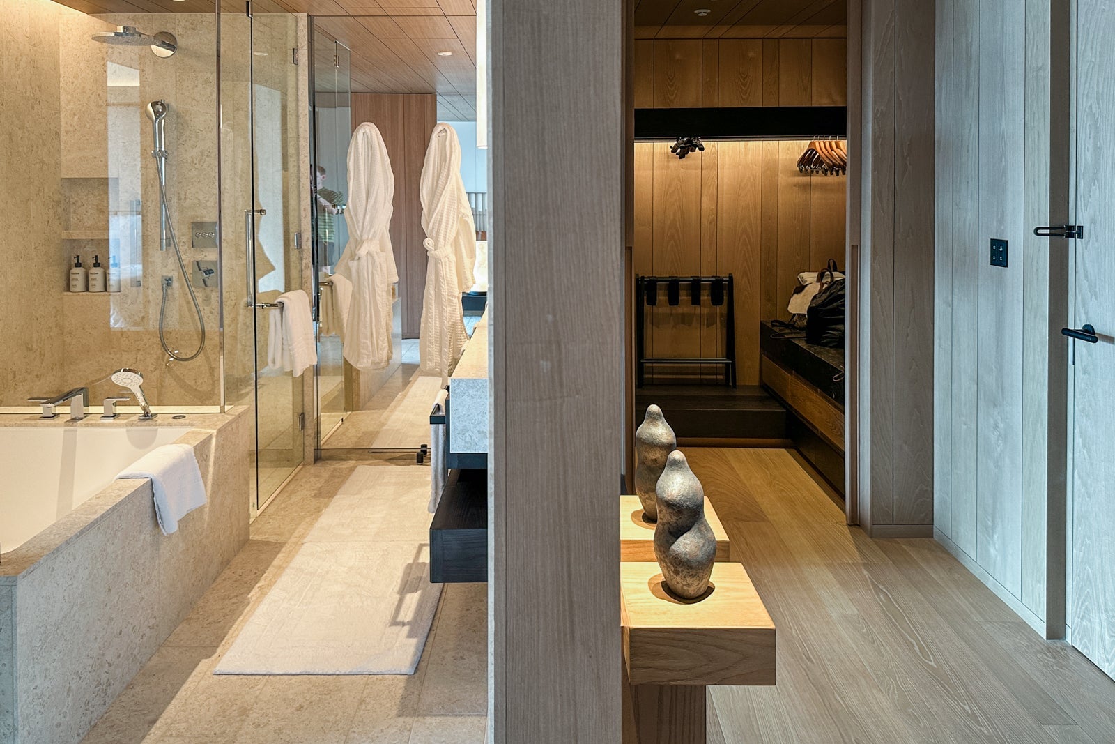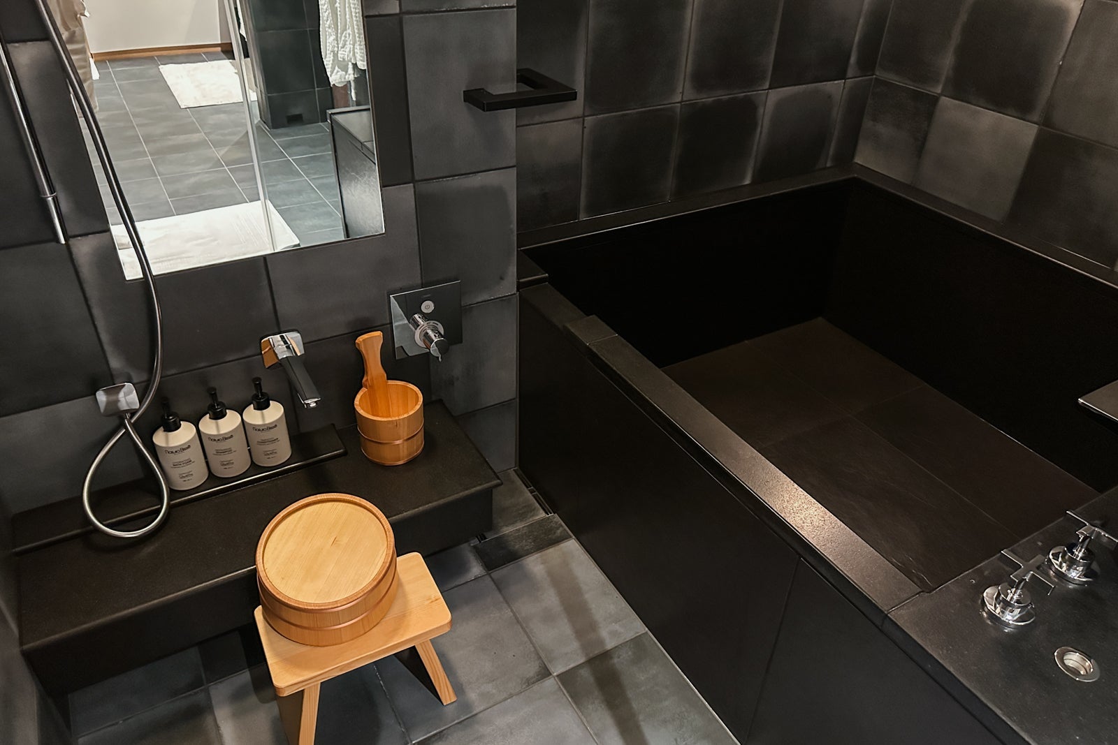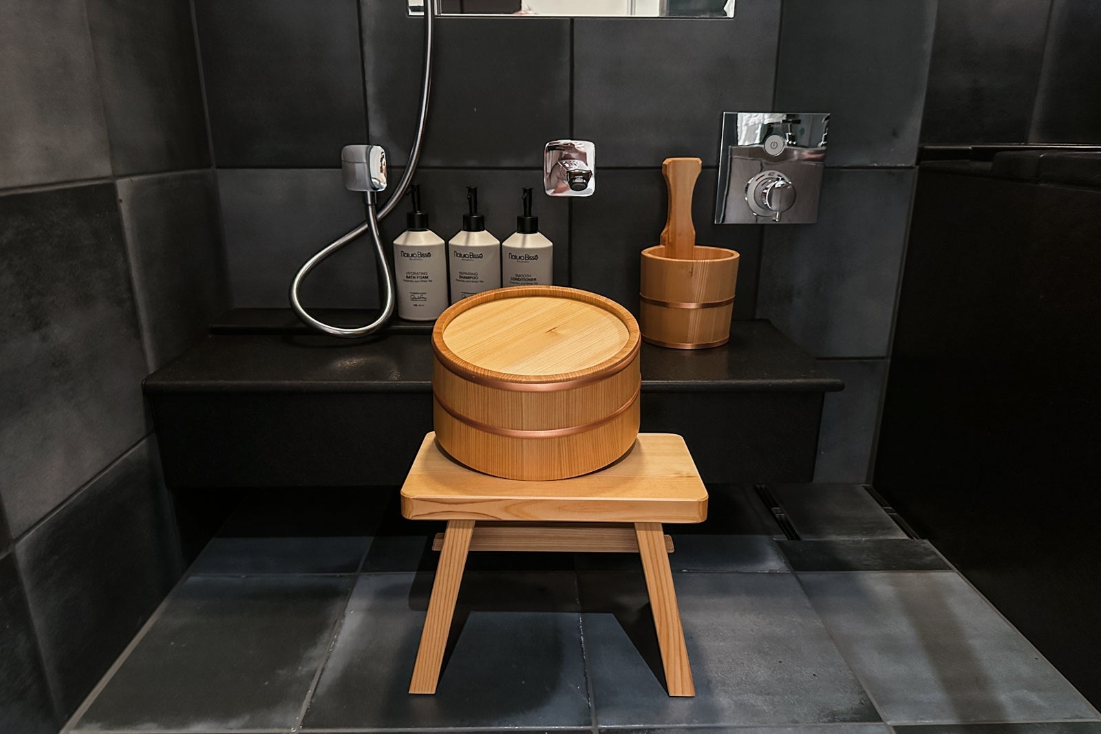 The bathing area of the room is a perfect example of old meets new, as a small wooden bench and bucket sit in the shower, alongside the same Natura Bisse products, allowing for a traditional Japanese-style bath where you can fill the bucket, sit on the bench and bathe. In a traditional situation, you might rinse, get in the neighboring bathtub and soak and then get out and really wash off. But since it's a private experience, you can enjoy the bathtub/shower combo however you like.
