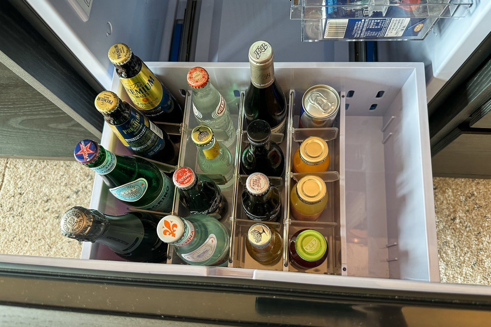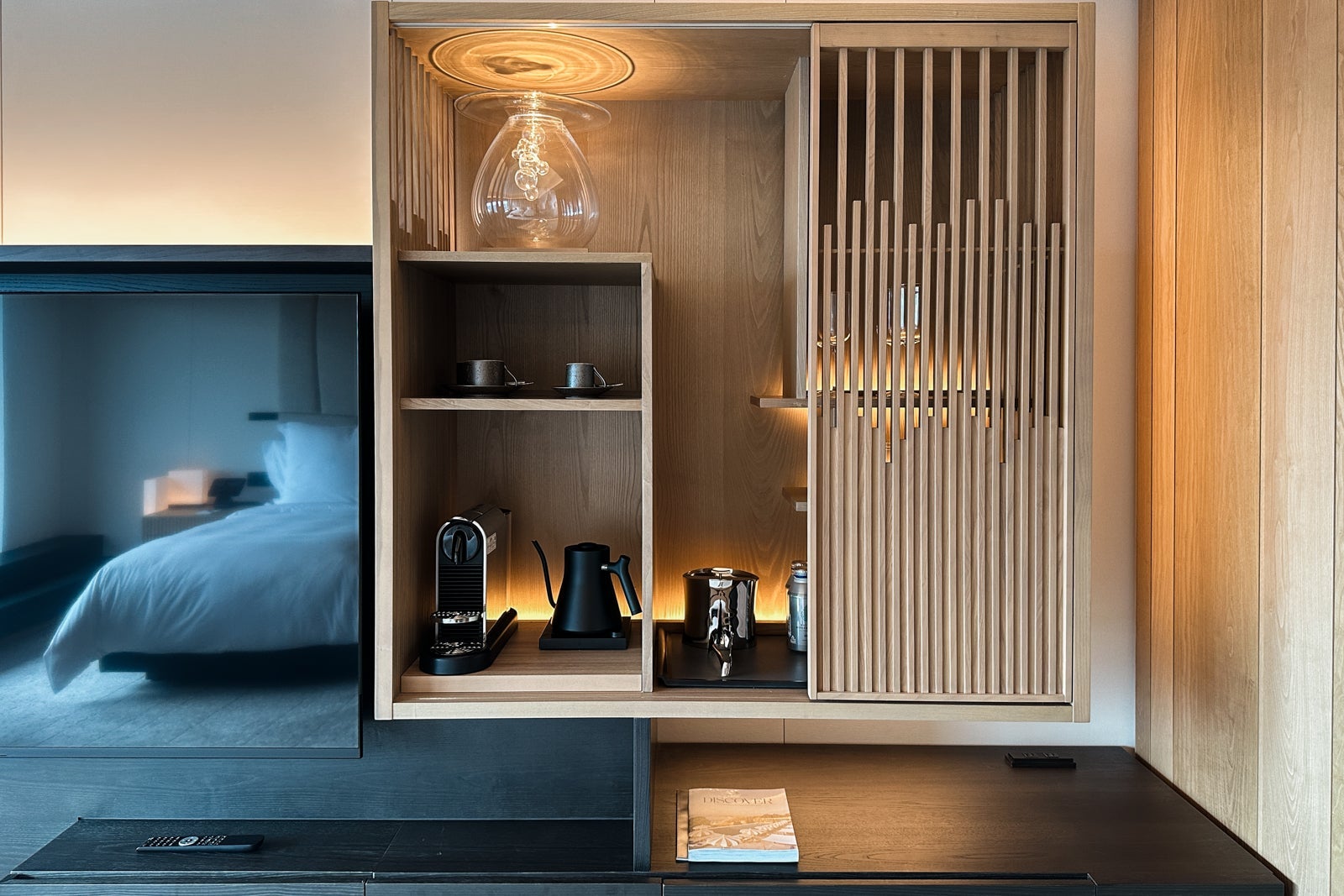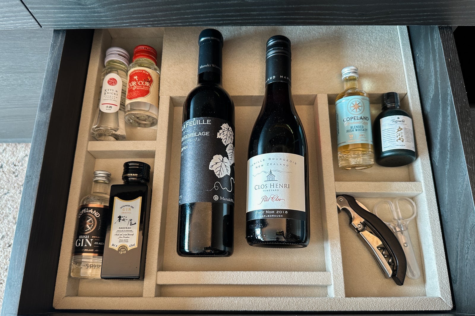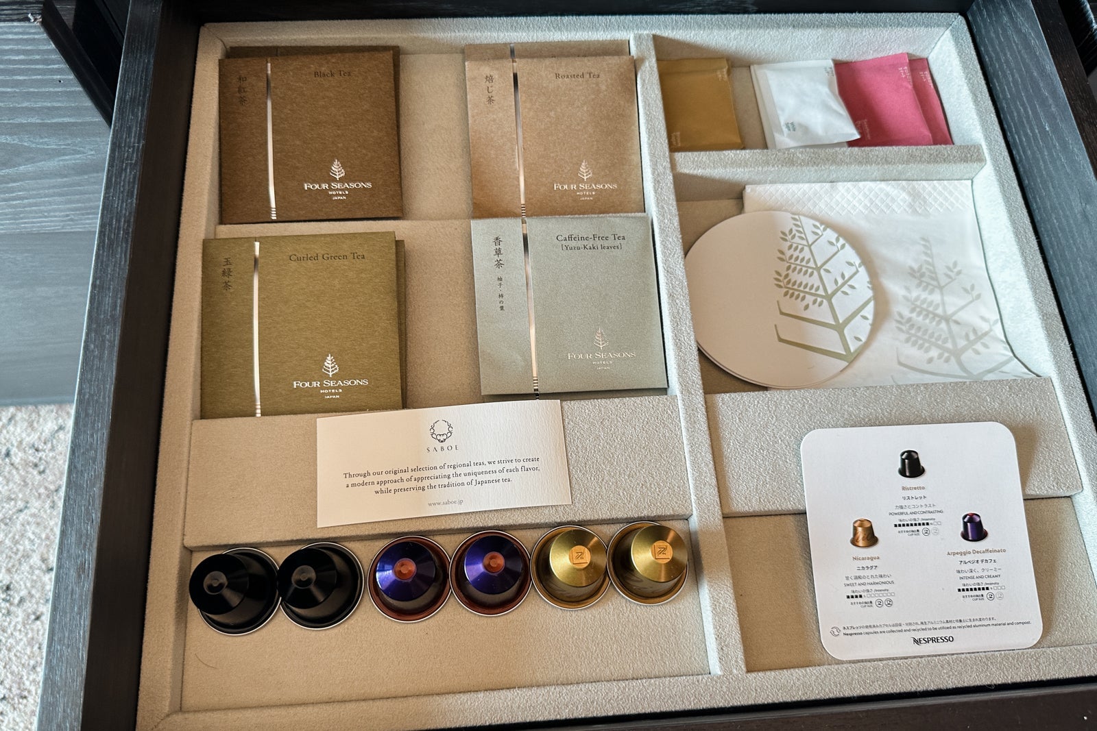Stored in and around the space were Nespresso pods, various Japanese teas, sodas, juices, wines, spirits and beers. Also in the room were various snacks "with compliments" including a little bag of Four Seasons-branded black pepper honey nuts that I will dream about for the rest of my life.