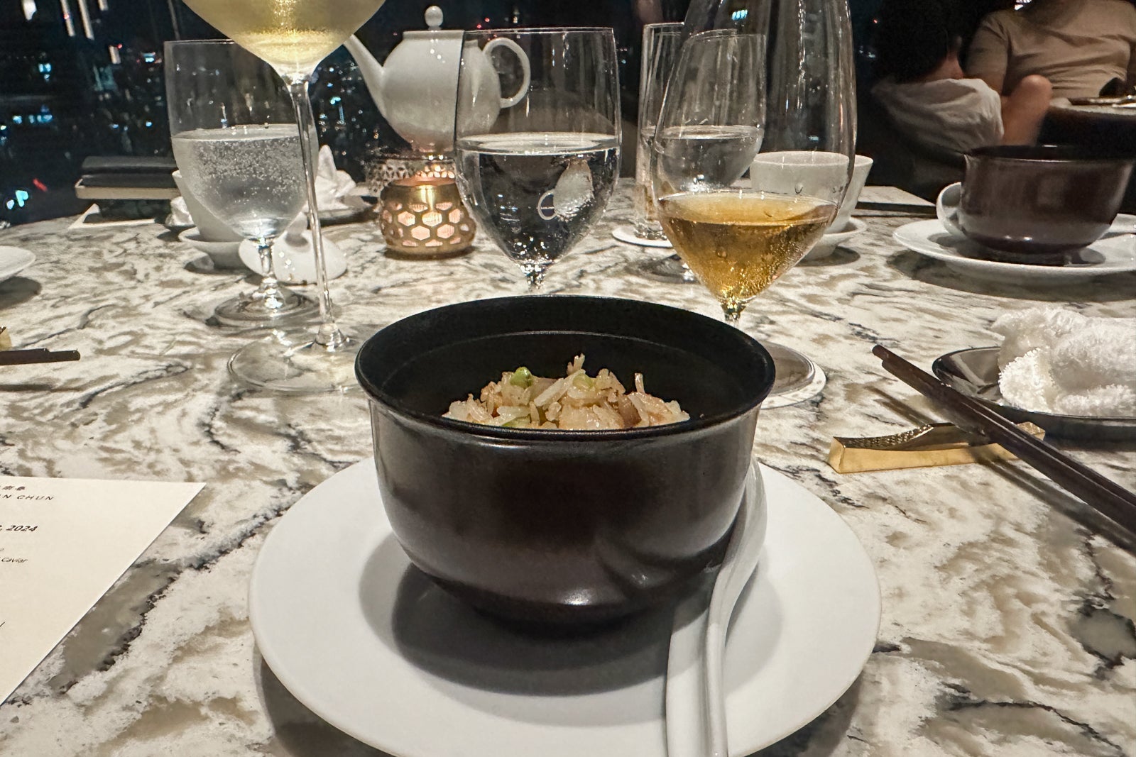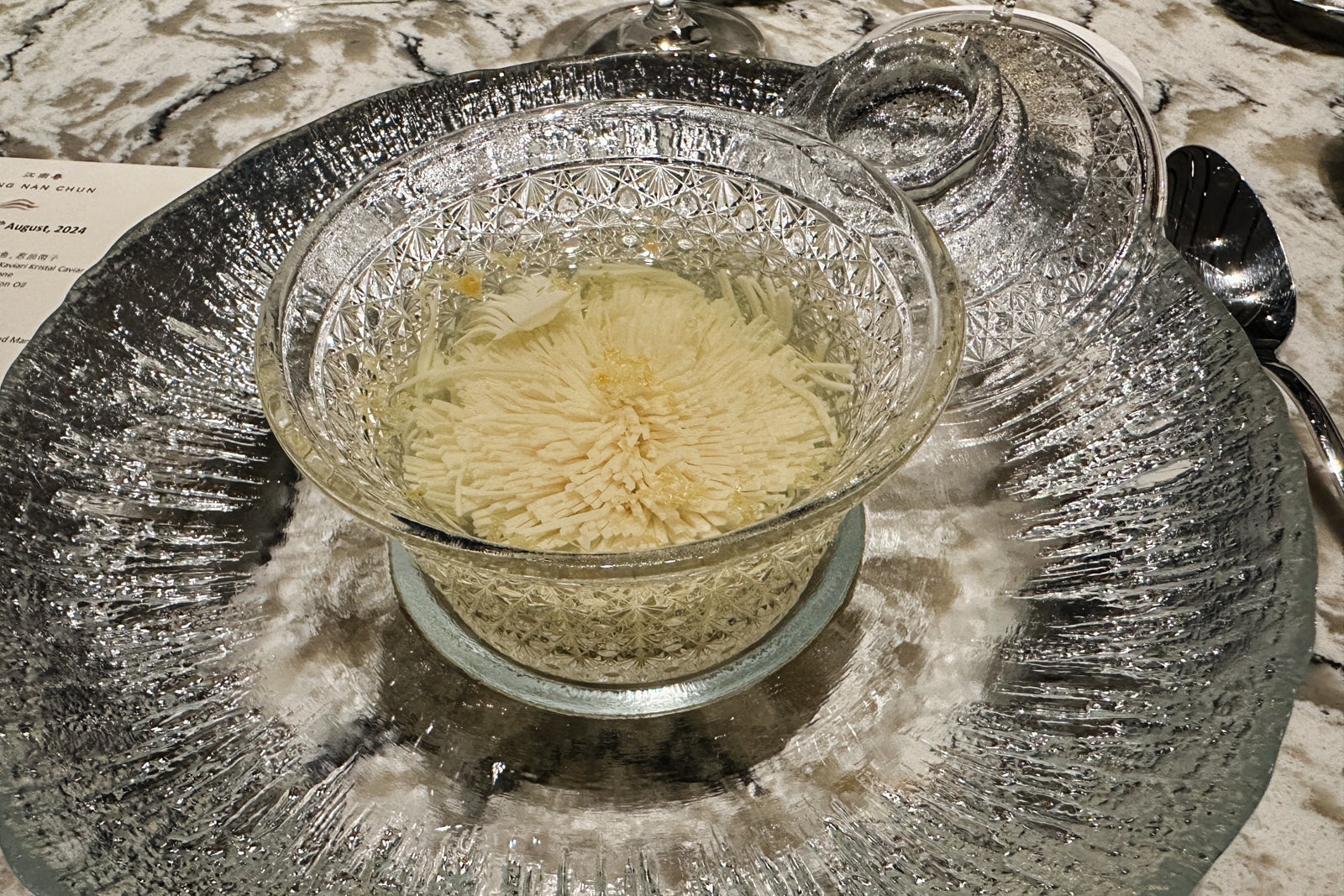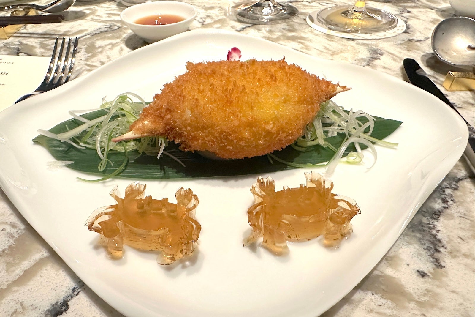 Our tasting menu was incredible and featured a few standout items that I loved, like a marinated slow-cooked egg with Kaviari Kristal caviar, chilled cherry tomatoes infused with preserved plums, marinated lobster in Sichuan pepper oil, a deep-fried crab shell stuffed with crab meat that was absolutely mouthwatering and came with two crab-shaped jellies, and, for dessert, a handcrafted bean curd flower with rock sugar syrup that was honestly too gorgeous to eat ... just kidding, I ate it.