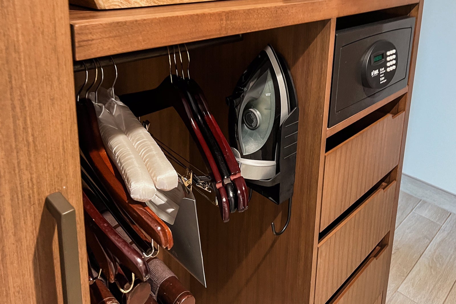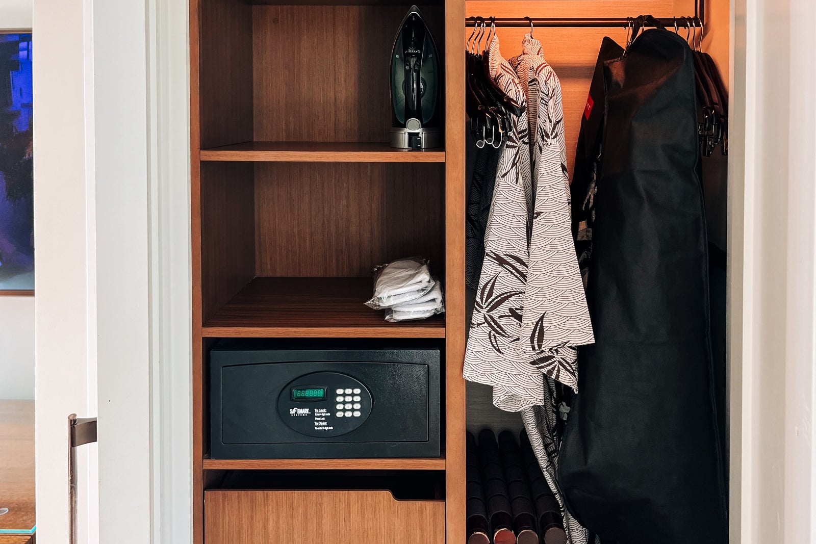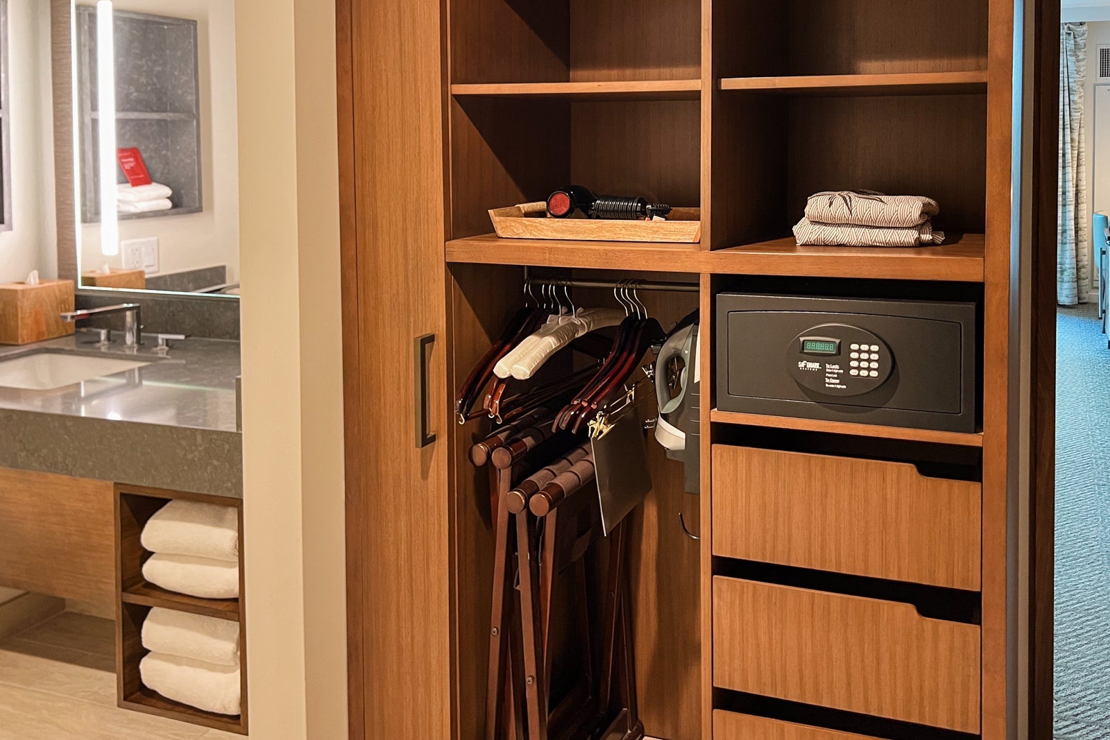 The closets faced the front door and didn't have closing doors (except for the space holding the iron and ironing board). There were a few drawers and a safe, along with a few hangers, robes and slippers. While this style of closet did allow the room to feel more open, there weren't a ton of places to put luggage and clothes.
