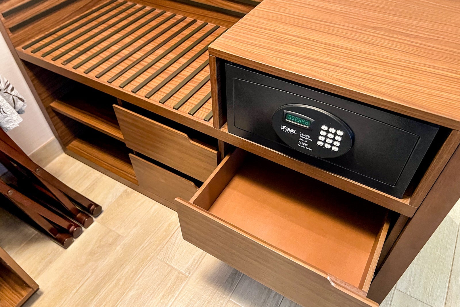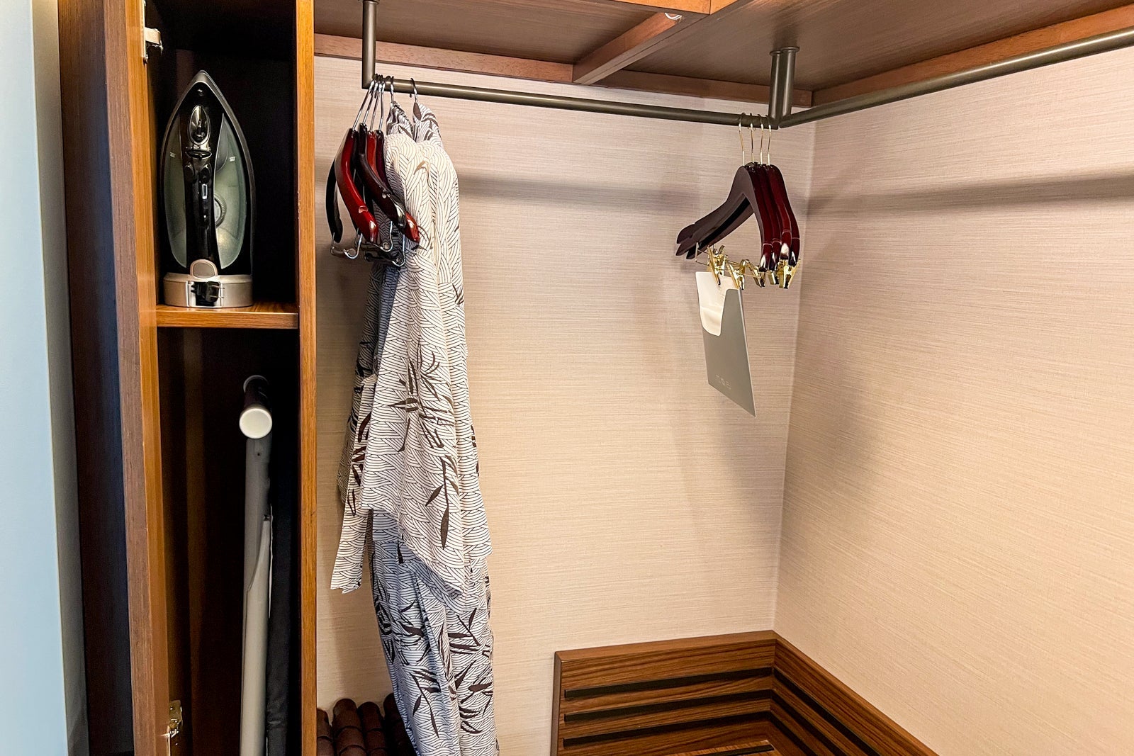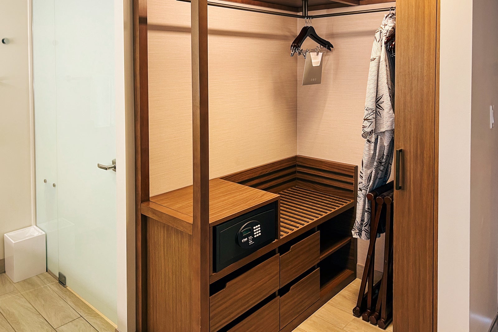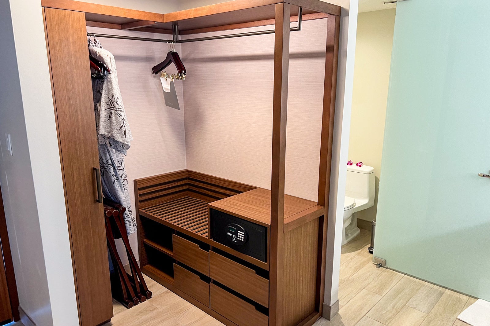 The closets faced the front door and didn't have closing doors (except for the space holding the iron and ironing board). There were a few drawers and a safe, along with a few hangers, robes and slippers. While this style of closet did allow the room to feel more open, there weren't a ton of places to put luggage and clothes.