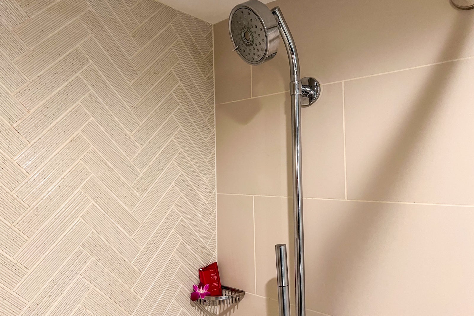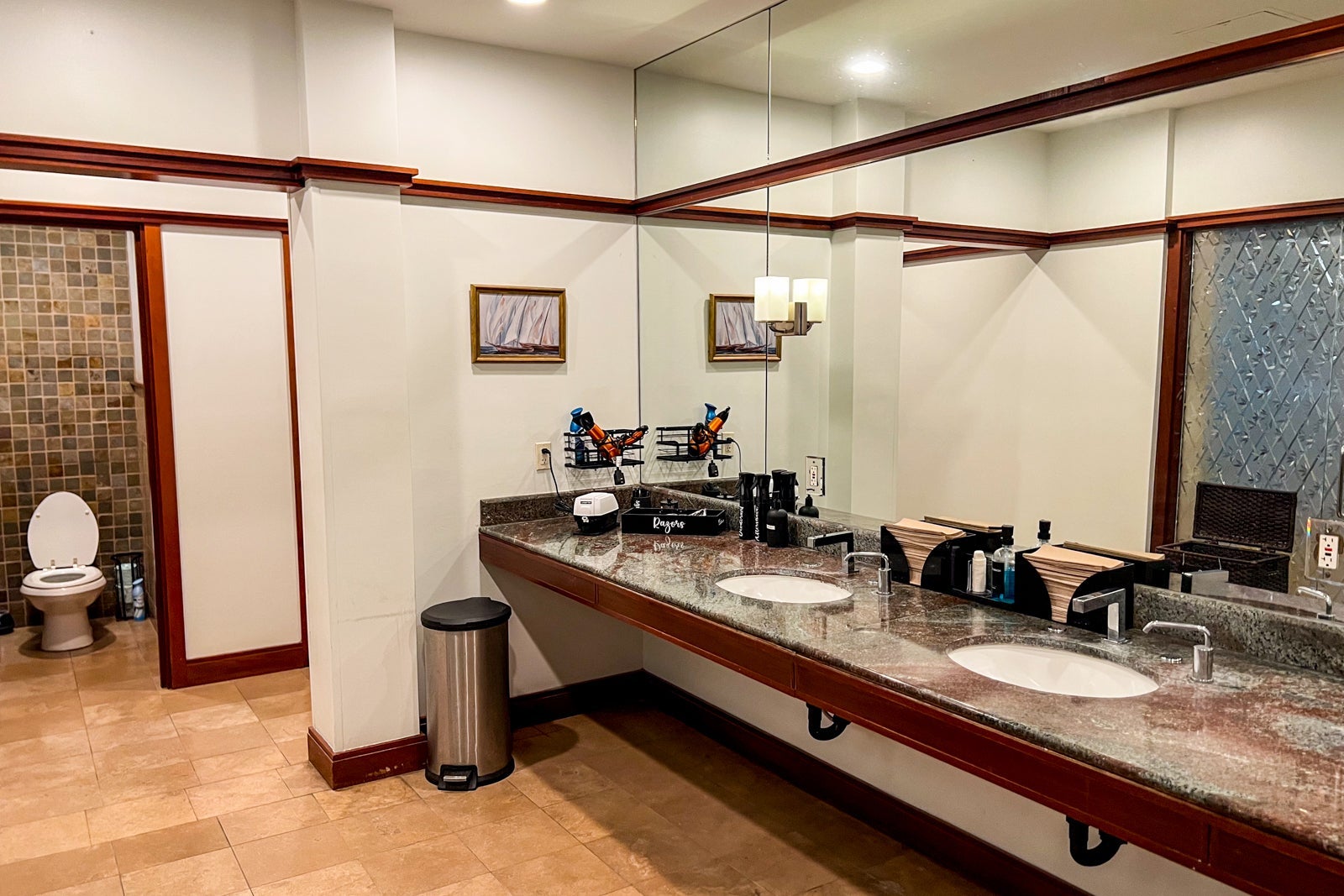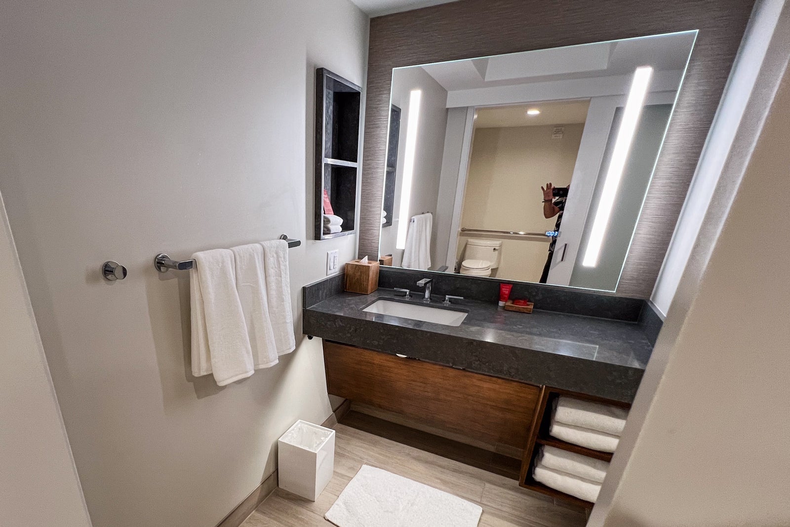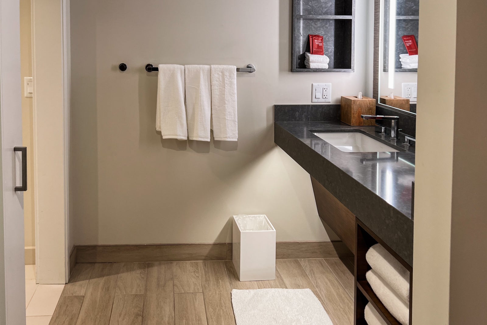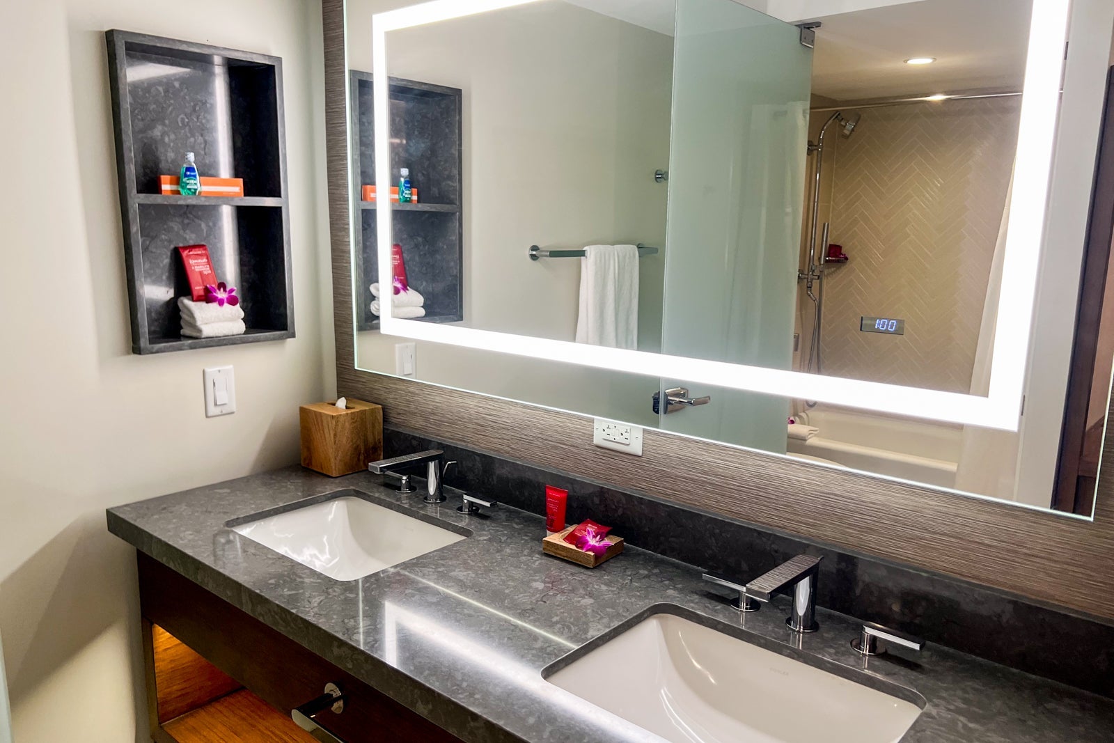 The bathrooms at the hotel have gotten a major upgrade with larger, more open spaces, including double-sink vanities and modern fixtures.