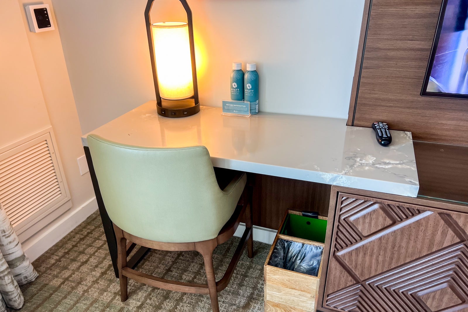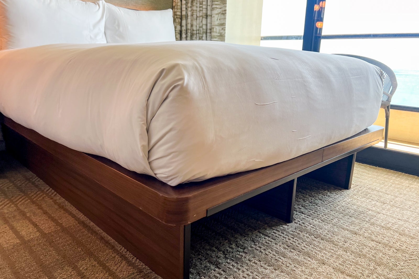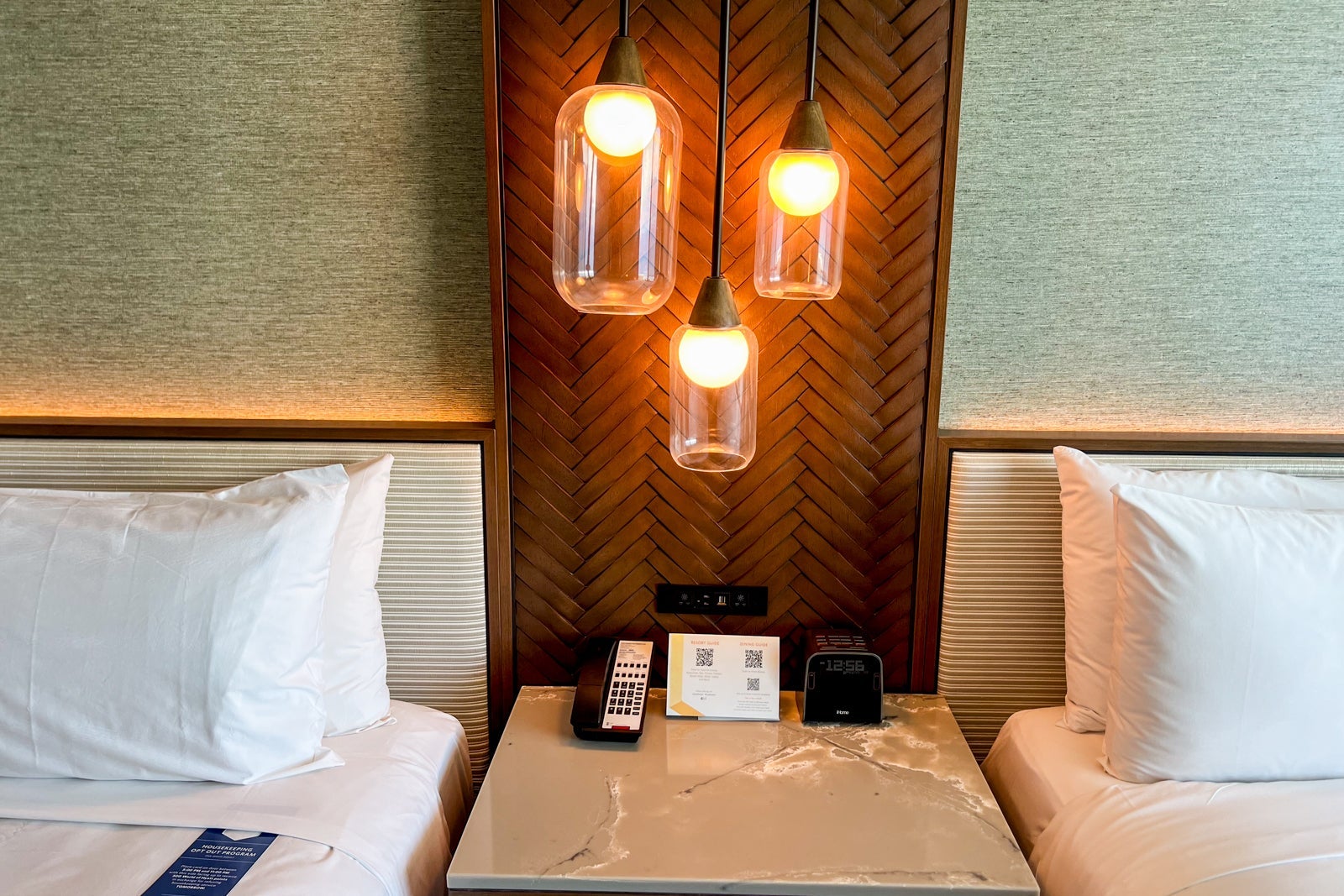 Inside the room, I found plenty of outlets, both for standard plugs and USB ports, as well as modern lighting, blackout curtains and a small desk. There was a 48-inch flat-screen television with lots of channels that also allowed for Google Chromecast streaming. The fast Wi-Fi was free for World of Hyatt members. There were also convenient spaces under the comfortable beds to store some items as well.