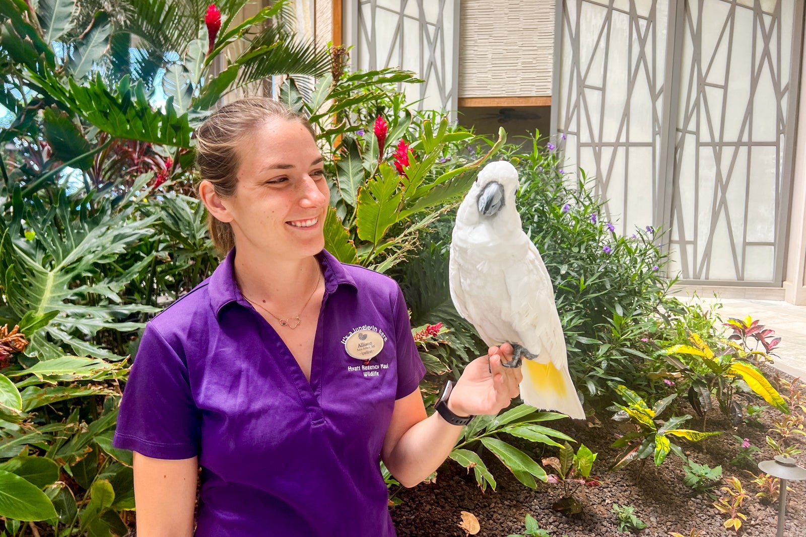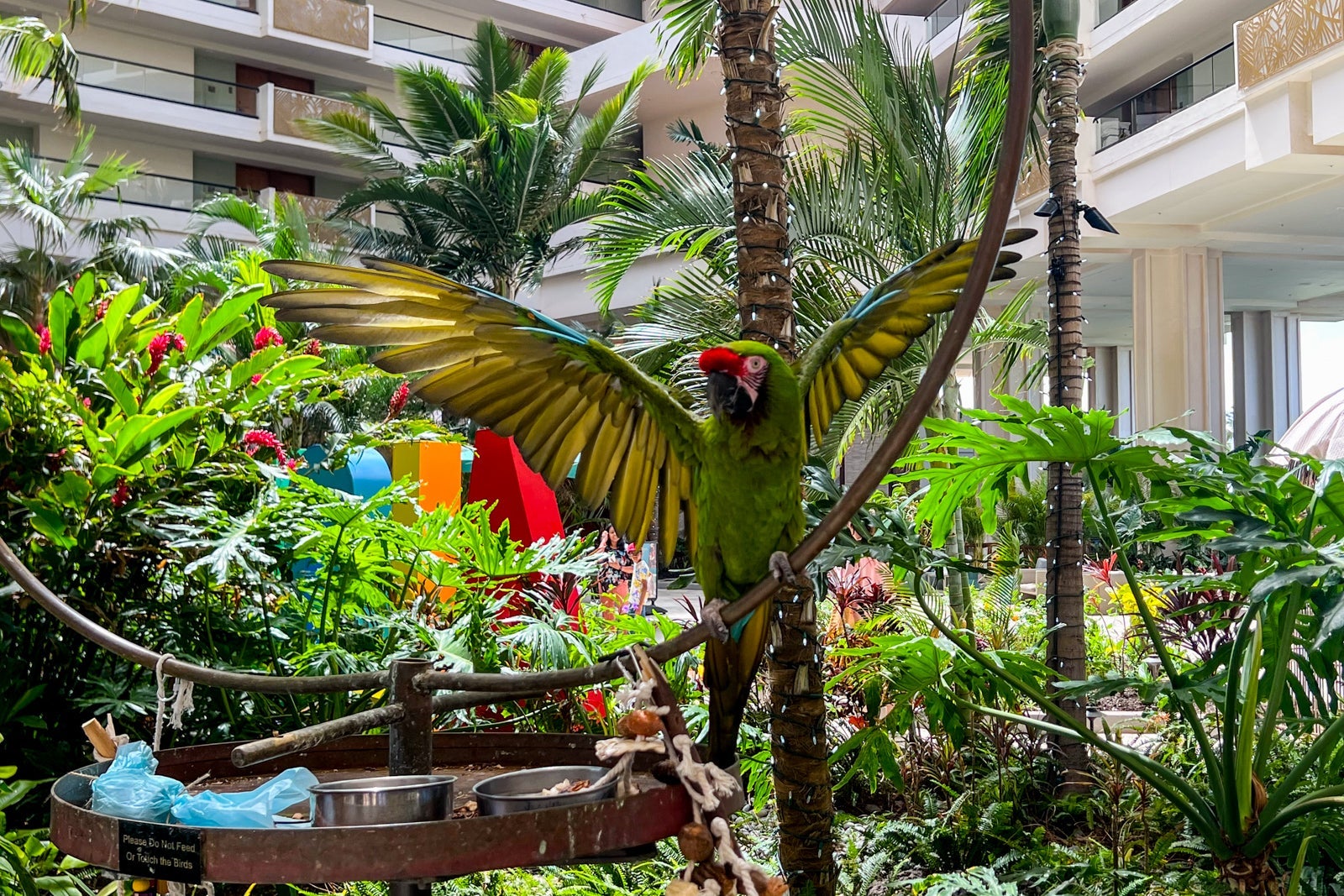 Parrots and other types of exotic bird species are housed around the resort, with some of the hotel's biggest bird stars brought out during the day in large enclosures around the property.