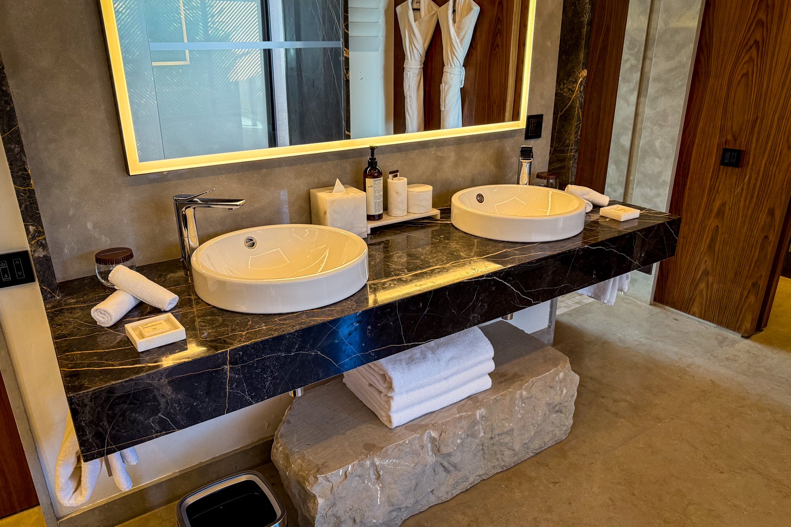 A double sink, complete with all the expected luxury toiletries, was equipped with lighted mirrors, and a vanity was set up with a small chair and additional lighted mirrors.