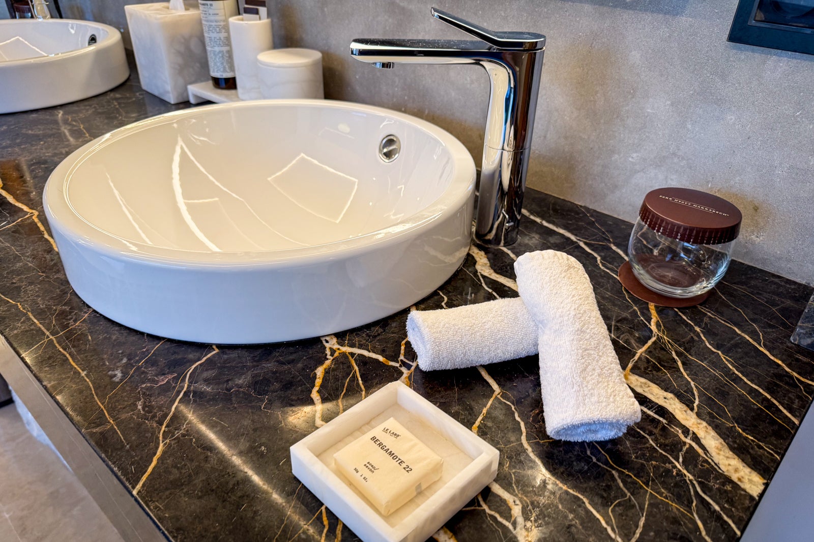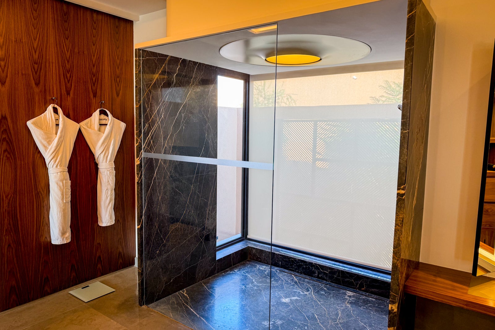 The shower, made of sleek veined marble, was eye-catching, featuring Le Labo amenities and a large overhead rain shower. I could have spent hours in this bathroom.