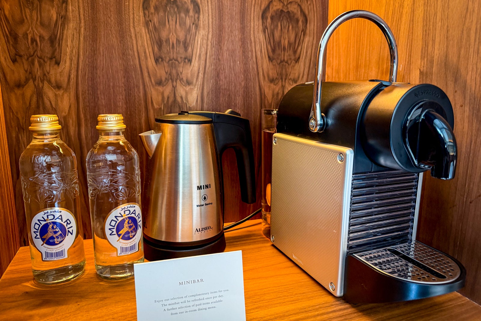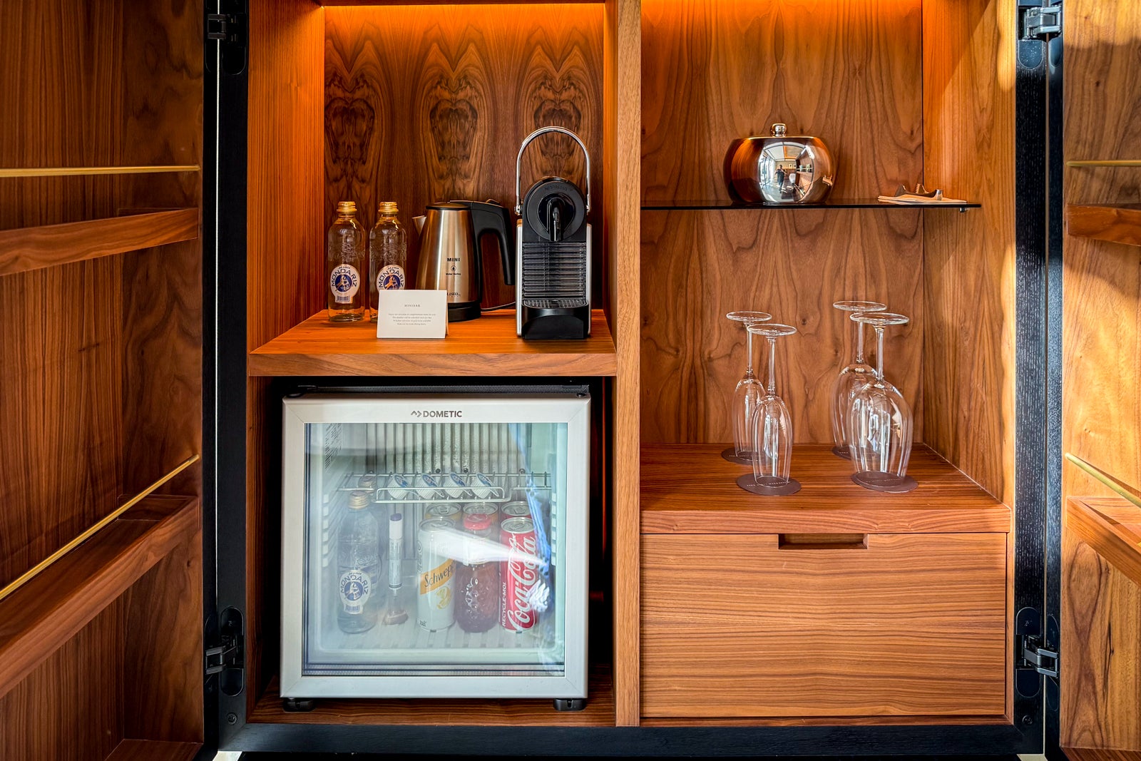 The space featured a beautiful cabinet that opened up to reveal a minibar, a small fridge, a tea kettle, a Nespresso coffee machine and glassware. The cabinet had several complimentary items available for guests, including Coke and Diet Coke, as well as dried olives and delicious strawberry wafers by Maison Amaury.