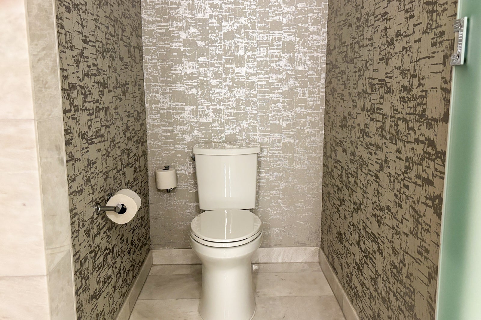 On one side, a discreet wash closet housed the toilet, while the other held a rainfall shower equipped with a hand-held shower wand. Adjacent to the dual-vanity sink on the left was a deep soaking tub that invited relaxation.
