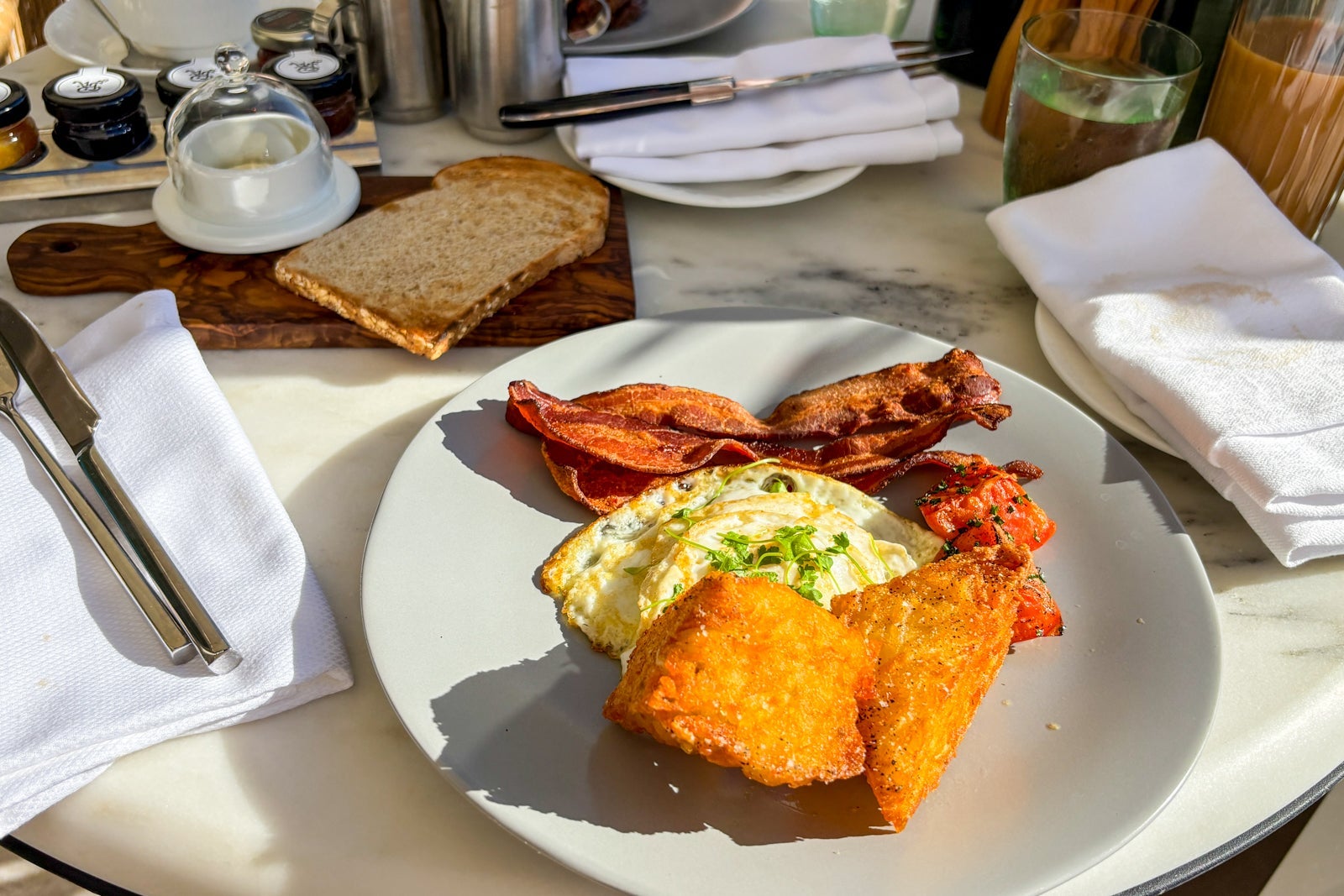 We enjoyed our lunch so much the first day that we also chose to have both breakfast meals at Riva. I had the sfoglina breakfast that comes with two eggs any style, hash browns, a choice of meat, roasted tomato and toast ($24). I'm a creature of habit when it comes to my coffee, and I ordered an iced vanilla latte ($8) each morning that was delicious each time. The next time we ate here, I craved something more indulgent, so I opted for the Riva waffle topped with Nutella, caramelized bananas and blueberries ($19).