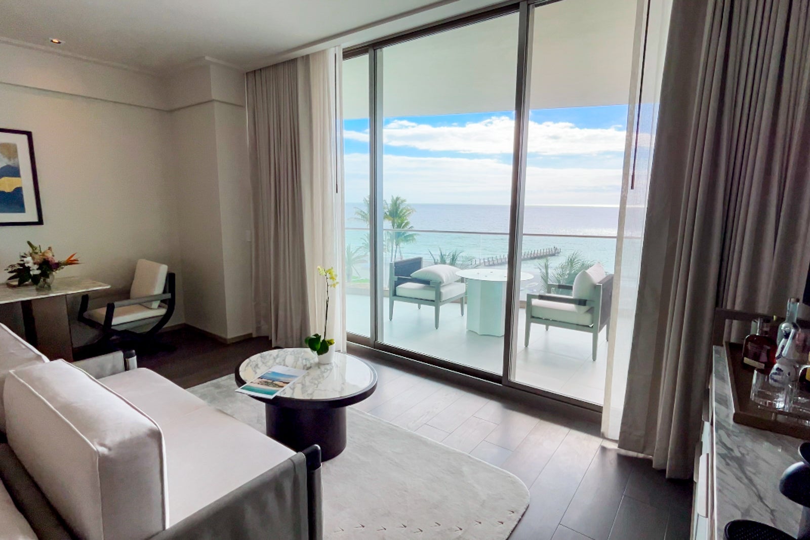 Beyond that is a generously sized living area with a large flat-screen TV and ample seating. And like the rest of the resort, the room's true standout feature has to be the floor-to-ceiling windows that frame the terrace, offering breathtaking ocean views.