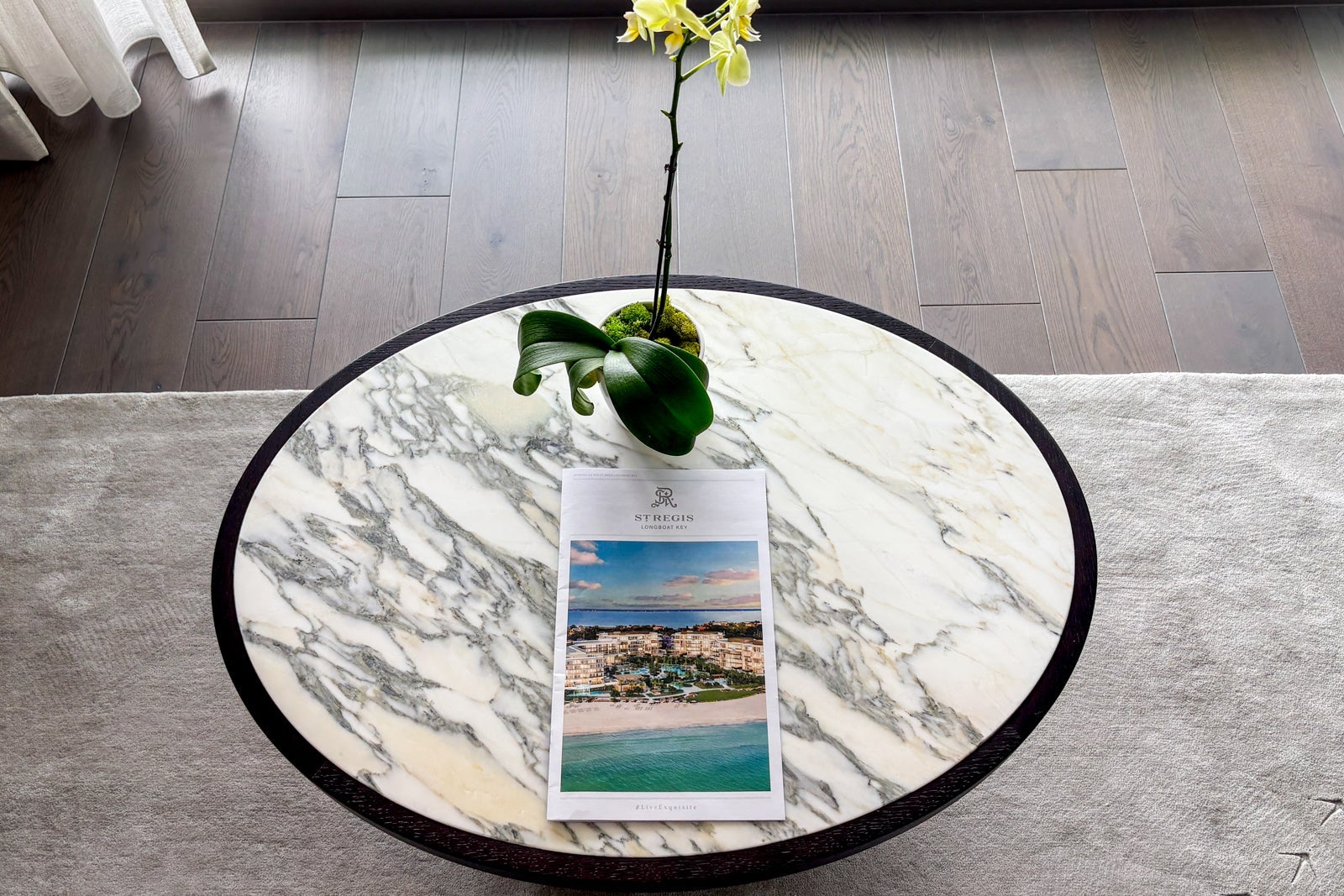 An oval marble dining table with a sweet welcome treat was waiting for me: a chocolate turtle placed in a pool float with a pink signature pattern designed just for The St. Regis Longboat Key Resort.