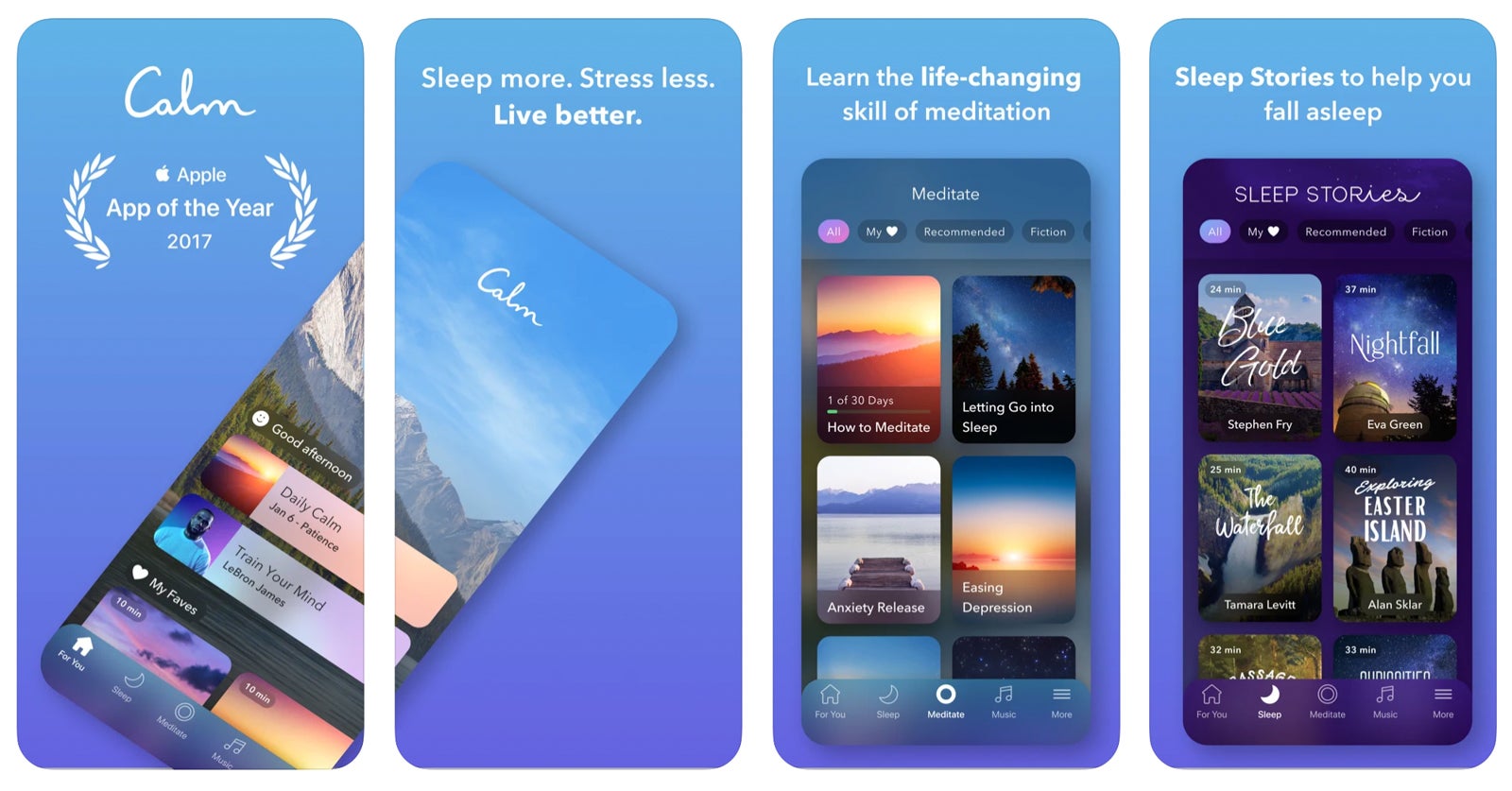 Calm offers meditations on topics such as self-awareness, calming anxiety, breathing, lowering stress levels and happiness, among others. The app also has music options for focusing, relaxing and sleeping, as well as stories for adults and content for kids.