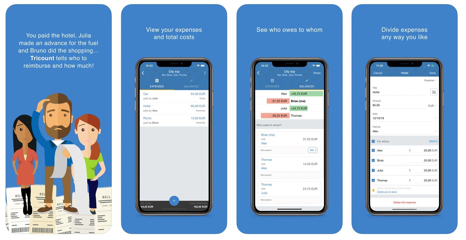 Each time someone pays for something, you enter the amount in Tricount, and the app splits everything up. You can also snap and store photos of receipts in the app. At the end of your trip, it will show the balances of who owes who what, making it easy to settle up.