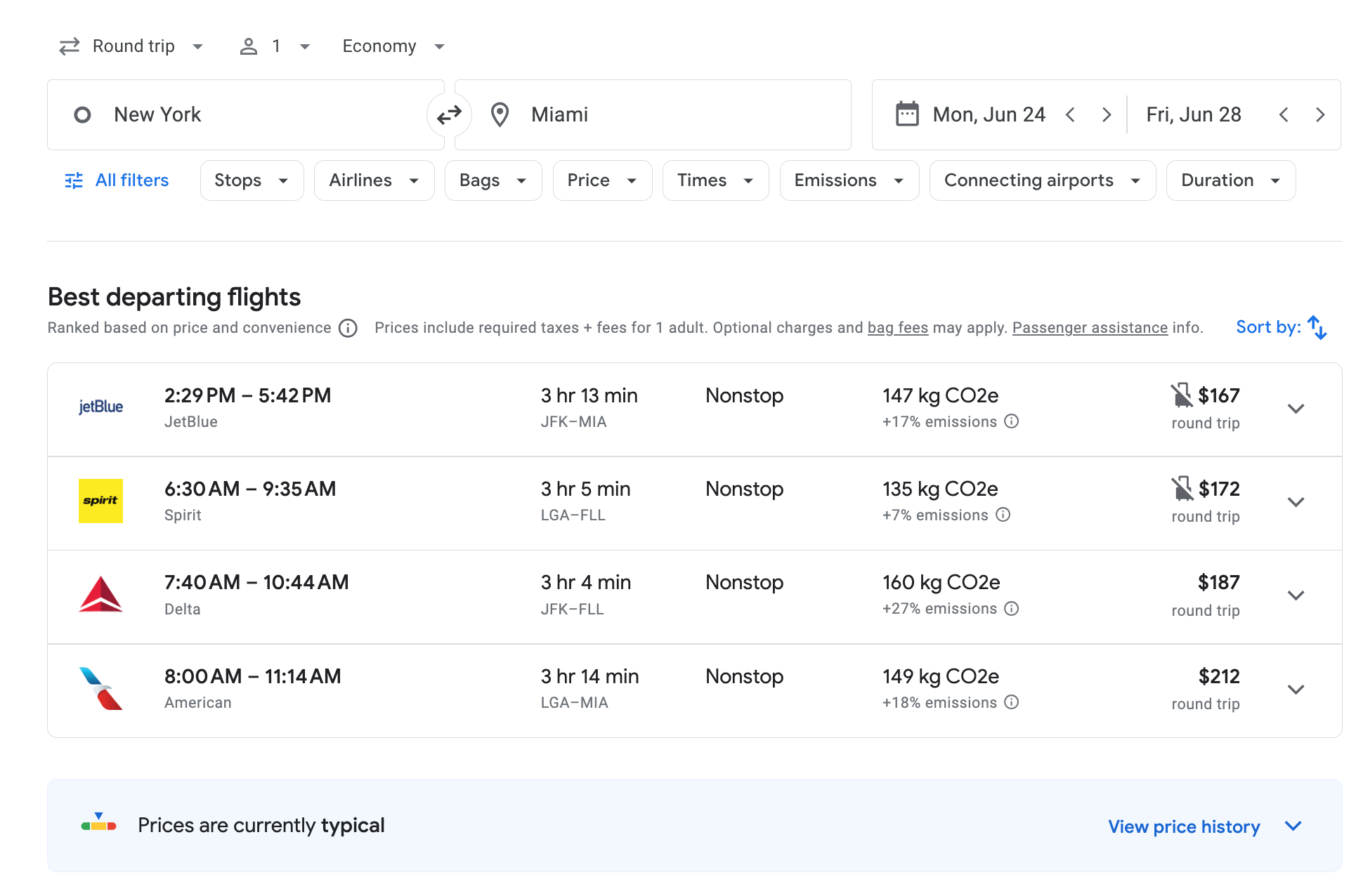 Instead of visiting each airline's website individually, search an aggregator site like Google Flights, which shows numerous airlines' prices for a particular route.