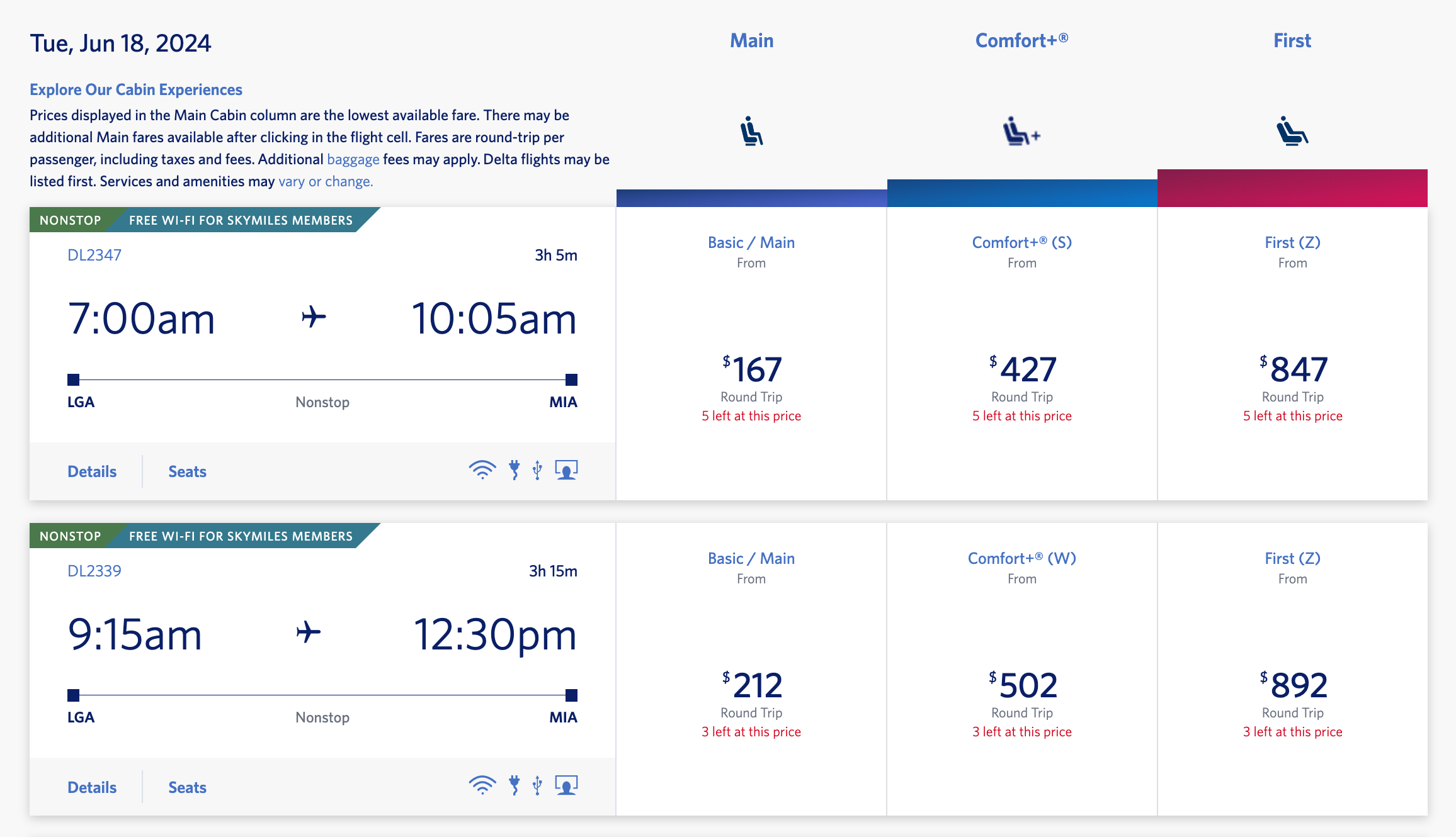 Many airlines will even tell you how many are left at that price to make this a bit easier. Take the below flight from New York City's LaGuardia Airport (LGA) to Miami International Airport (MIA) on Delta Air Lines for example.